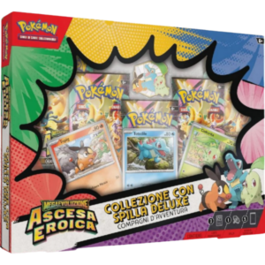 Box Pokémon in italiano con bustine, carte promozionali e una spilla deluxe a tema starter.