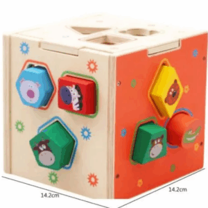 Gioco montessori in legno: cubo con blocchi a forma di animali e forme geometriche.