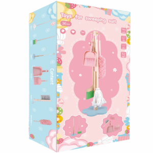 Gioco di imitazione in legno con scopa, mocio, spolverino e accessori.