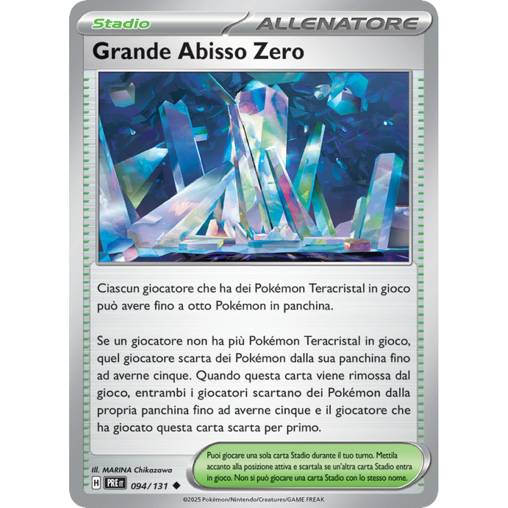 Se un giocatore non ha più Pokémon Teracristal in gioco, quel giocatore scarta dei Pokémon dalla sua panchina fino ad averne cinque. Quando questa carta viene rimossa dal gioco, entrambi i giocatori scartano dei Pokémon dalla propria panchina fino ad averne cinque e il giocatore che ha giocato questa carta scarta per primo.