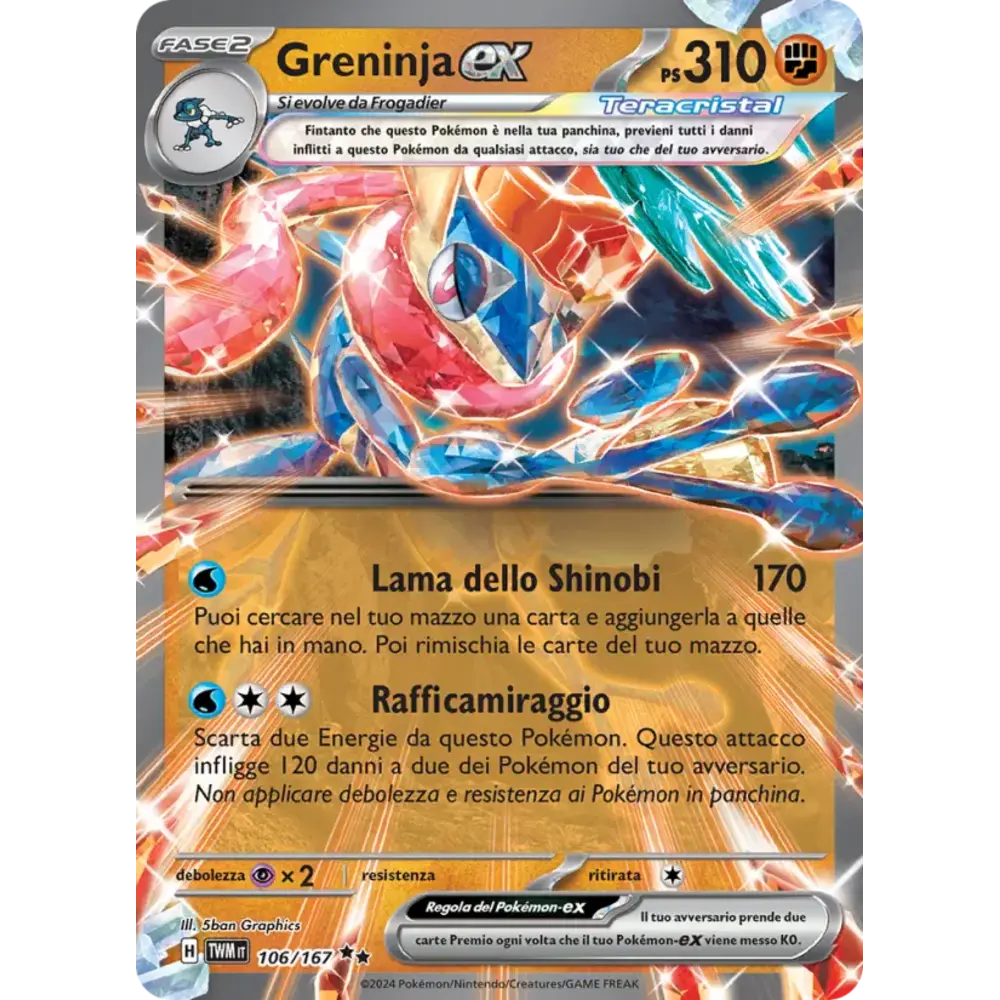 Scarta due Energie da questo Pokémon. Questo attacco infligge 120 danni a due dei Pokémon del tuo avversario. Non applicare debolezza e resistenza ai Pokémon in panchina.