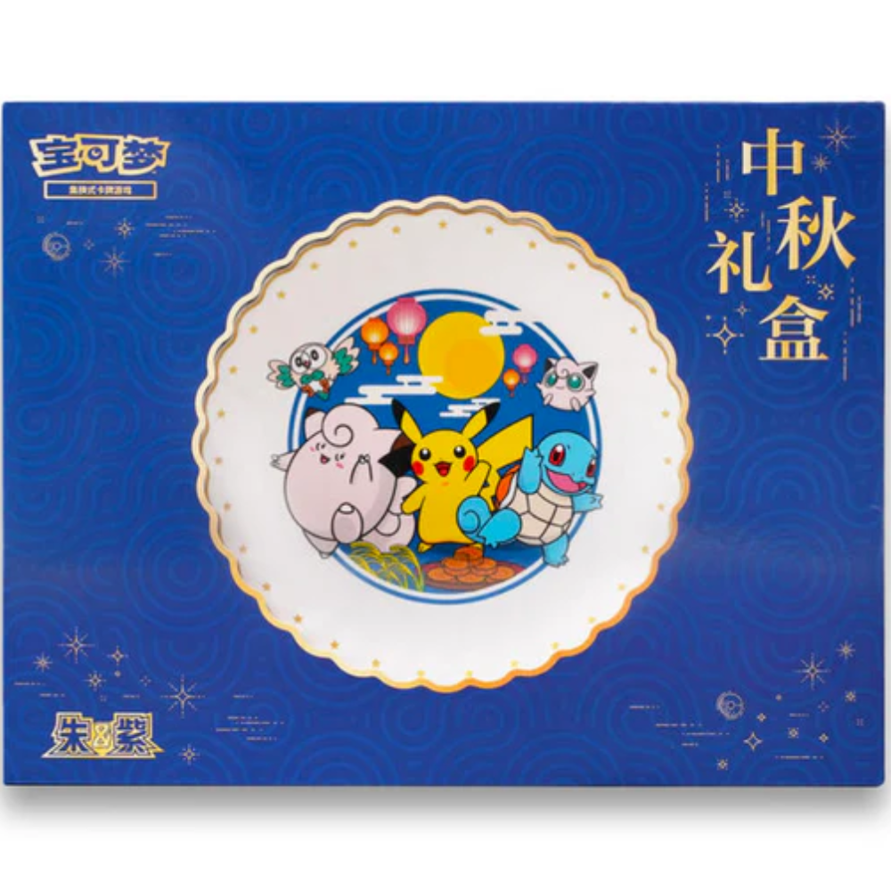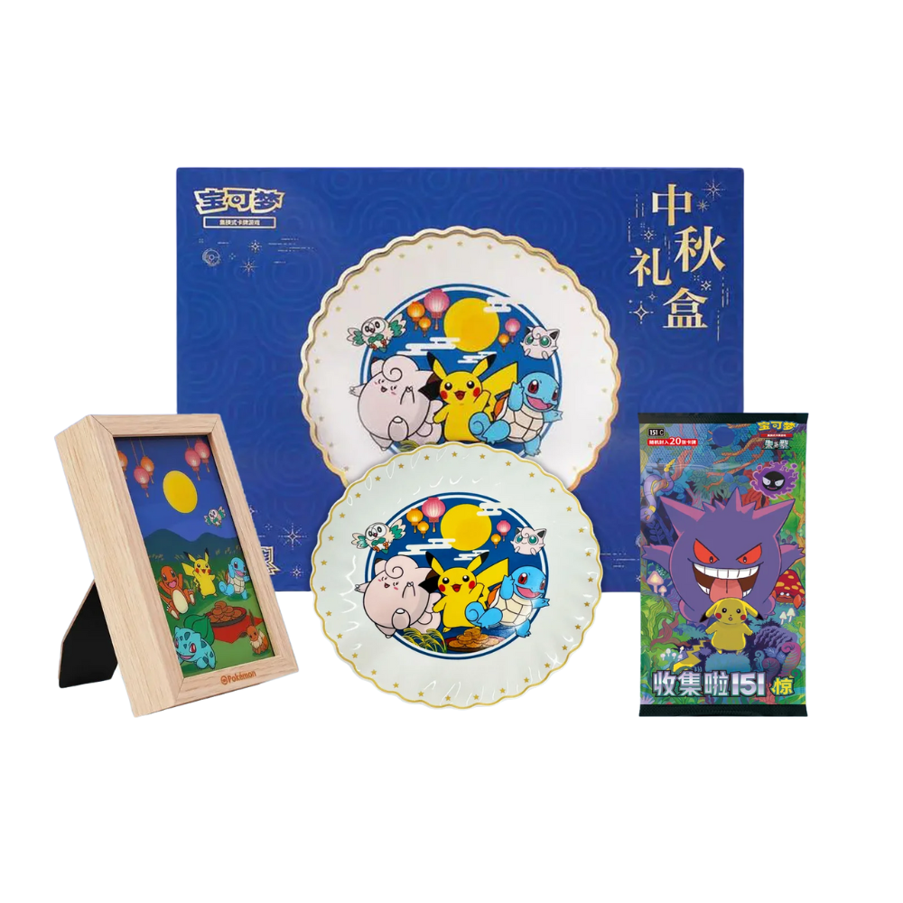 Il box presenta una confezione rigida di grande impatto visivo, decorata con illustrazioni a tema lunare e richiami al Mid Autumn Festival. All’interno sono inclusi due piatti decorativi finemente illustrati, ideali per esposizione in vetrina o su mensole, con protagonisti iconici della serie 151 in uno stile caldo e festivo.