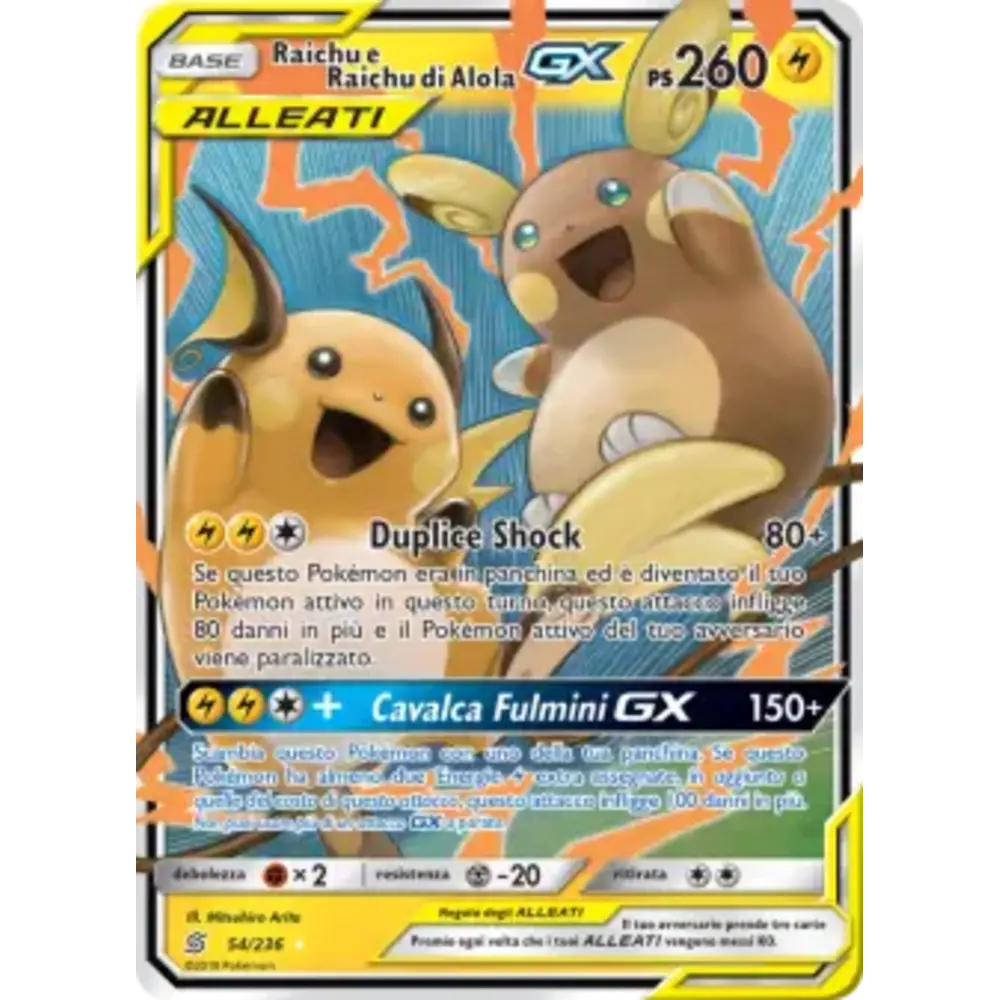 Scambia questo Pokémon con uno della tua panchina. Se questo Pokémon ha almeno due Energie Lightning extra assegnate, in aggiunta a quelle del costo di questo attacco, questo attacco infligge 100 danni in più. Non puoi usare più di un attacco GX a partita.