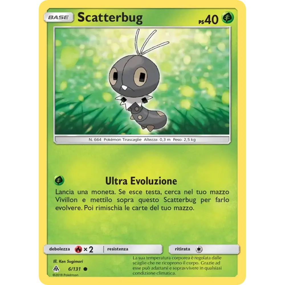 Lancia una moneta. Se esce testa, cerca nel tuo mazzo Vivillon e mettilo sopra questo Scatterbug per farlo evolvere. Poi rimischia le carte del tuo mazzo.