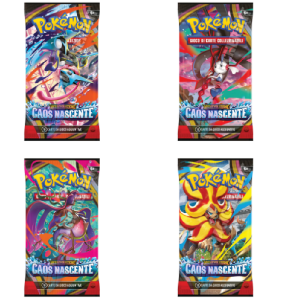 All’interno delle bustine sono presenti 10 carte selezionate casualmente che possono includere Pokémon, allenatori, energie e versioni ad alta rarità come holo e ultra rare. L’espansione Mega Evoluzione Caos Nascente introduce nuove meccaniche e sinergie strategiche che permettono ai giocatori di costruire deck più competitivi e dinamici.