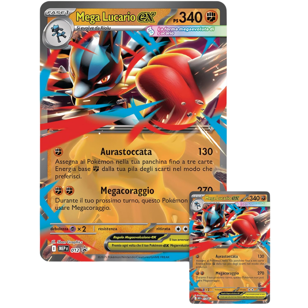 Accanto alla statuina, la collezione include la carta promo Mega Lucario EX, uno degli elementi più ricercati del set. L’illustrazione è dinamica e rappresenta la potenza della megavoluzione in un modo che colpisce subito l’occhio. È una carta che, una volta inserita in un album, dona immediatamente una sensazione di coerenza visiva e importanza. La scelta cromatica e la finitura fanno sì che la carta risalti in mezzo a una pagina di EX o di carte legate alla linea evolutiva di Riolu e Lucario.