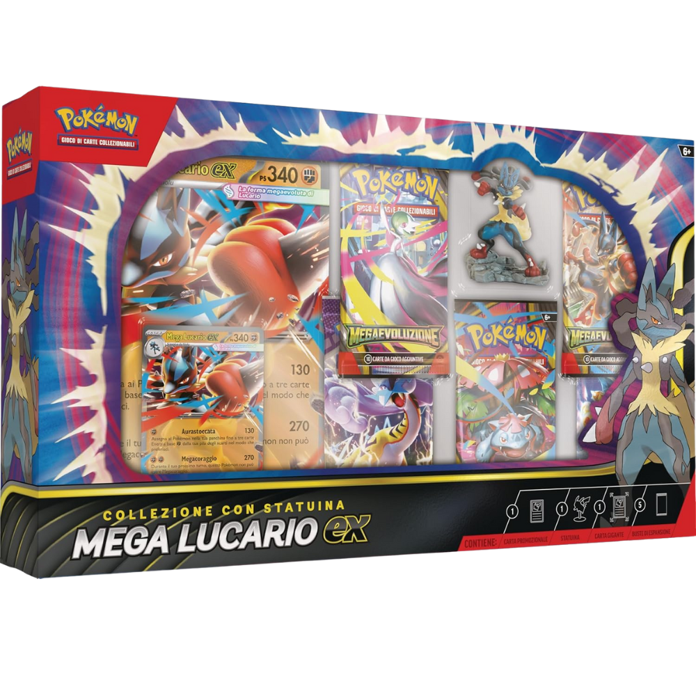 La Collezione con Statuina Mega Lucario EX unisce carte promozionali, buste d’espansione e una statuina dettagliata di Mega Lucario. Un set speciale pensato per arricchire collezioni e deck con un tocco unico.