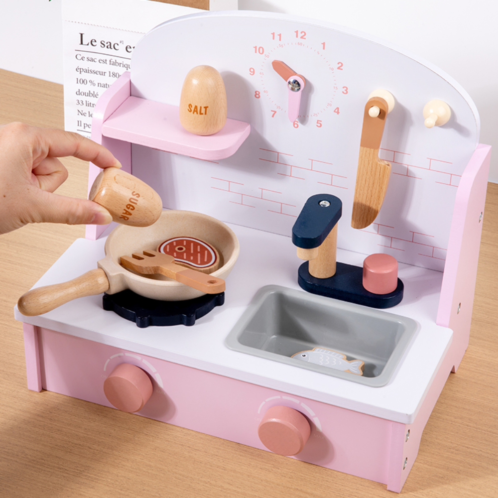 Il set include tutto ciò che serve per ricreare una piccola cucina casalinga: fornello con manopole che girano davvero, lavello con rubinetto, utensili in legno e una pentola in cui “cuocere” gli ingredienti. Gli accessori aggiuntivi come sale, zucchero e coltello rendono il gioco ancora più realistico, permettendo ai bambini di imitare ciò che vedono ogni giorno in cucina.