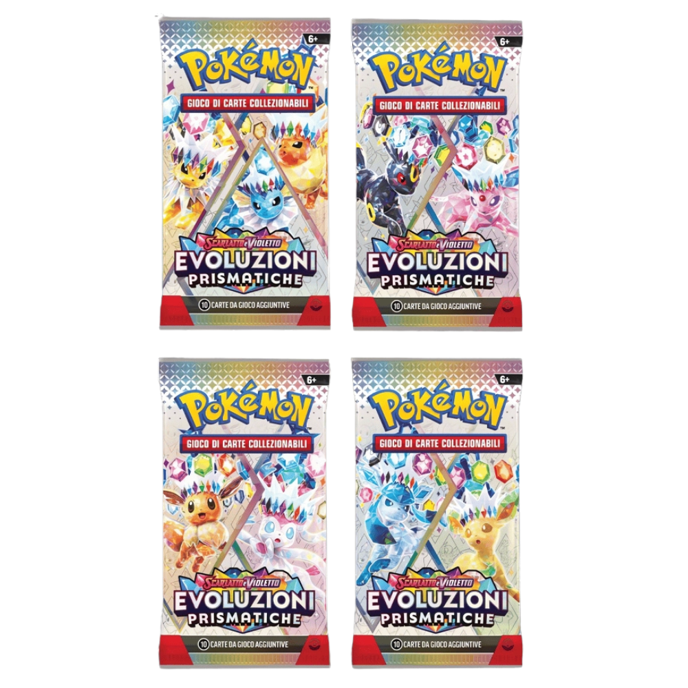 Un piccolo assaggio dell’espansione Evoluzioni Prismatiche: una bustina italiana da 10 carte che mette in scena Eevee e le sue evoluzioni in versioni sorprendenti. Tra forme Tera scintillanti, ex potentissimi e illustrazioni ricercate, ogni apertura può rivelare una delle nuove carte più desiderate del set.