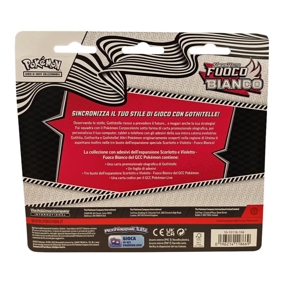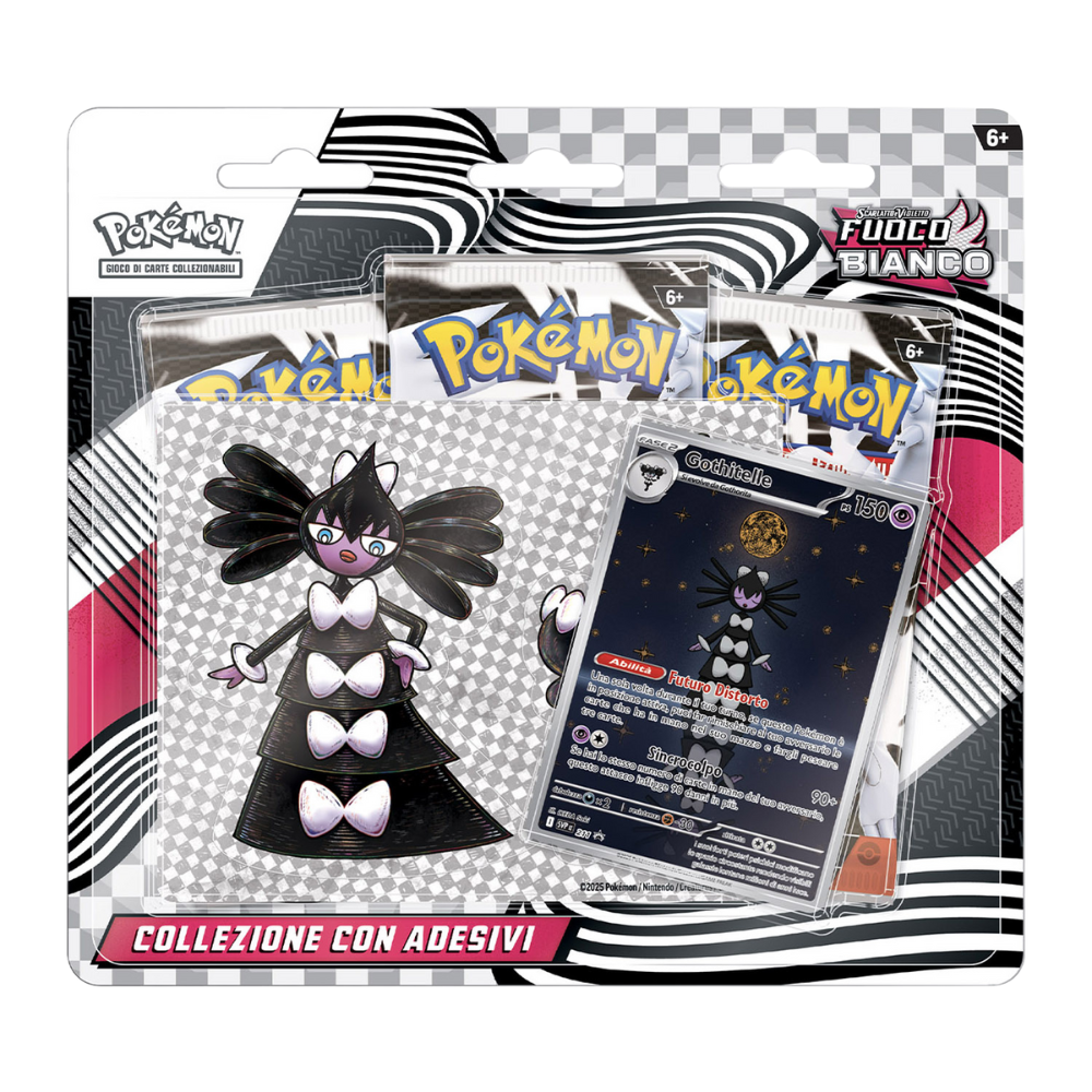 Preparati a dare un tocco di stile e a espandere la tua collezione con la Collezione con Adesivi “Fuoco Bianco”! Questo set è un modo fantastico per celebrare l’espansione Scarlatto e Violetto – Fuoco Bianco, offrendo non solo un assortimento di buste, ma anche un divertente foglio di adesivi con artwork ispirati al set.