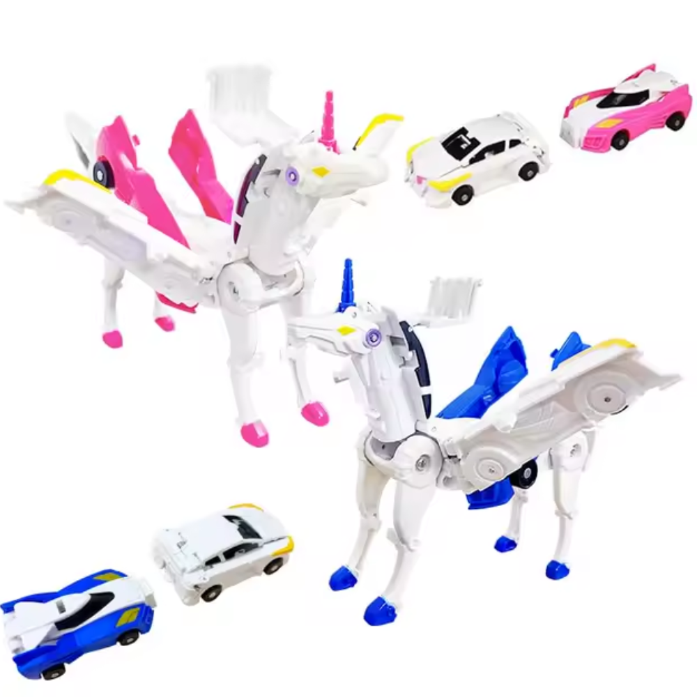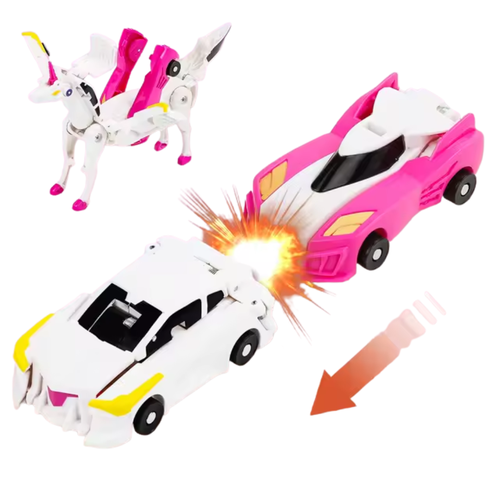 Hello Pegasus Unicorn è un giocattolo trasformabile pensato per sorprendere fin dal primo utilizzo. In modalità veicolo si presenta come un’auto compatta e facile da spingere, ideale per il gioco libero e per creare gare improvvisate. Il vero punto di forza emerge però nel momento dell’impatto: quando l’auto collide con un altro veicolo o un ostacolo, si attiva la trasformazione istantanea, convertendo il mezzo in un unicorno meccanico.