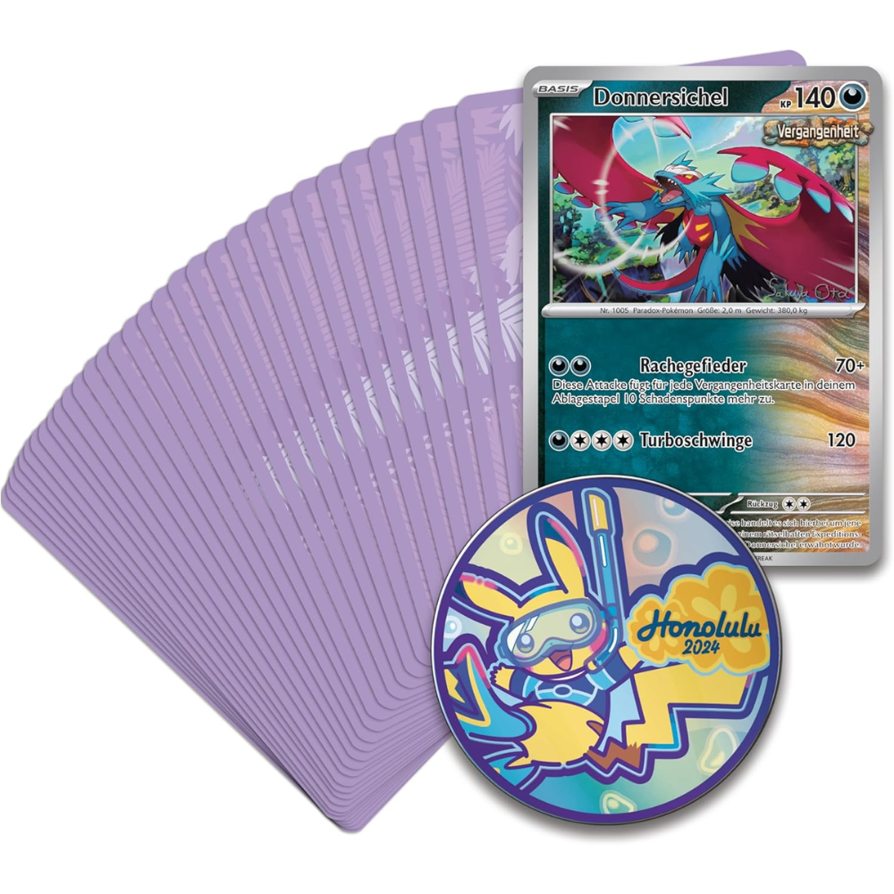 La confezione protegge e mette in evidenza la carta di copertina, mostrando Donnersichel in un’illustrazione estremamente dinamica, quasi in movimento. I colori metallizzati e le sfumature aranciate che circondano il Pokémon contribuiscono a rendere la carta visivamente potente, anche se nella versione Worlds presenta il retro speciale dedicato ai Campionati Mondiali. Questo retro è uno degli elementi più amati dai collezionisti: non solo conferisce unicità alle carte, ma le rende immediatamente riconoscibili come appartenenti a un evento preciso, in questo caso l’edizione 2024.