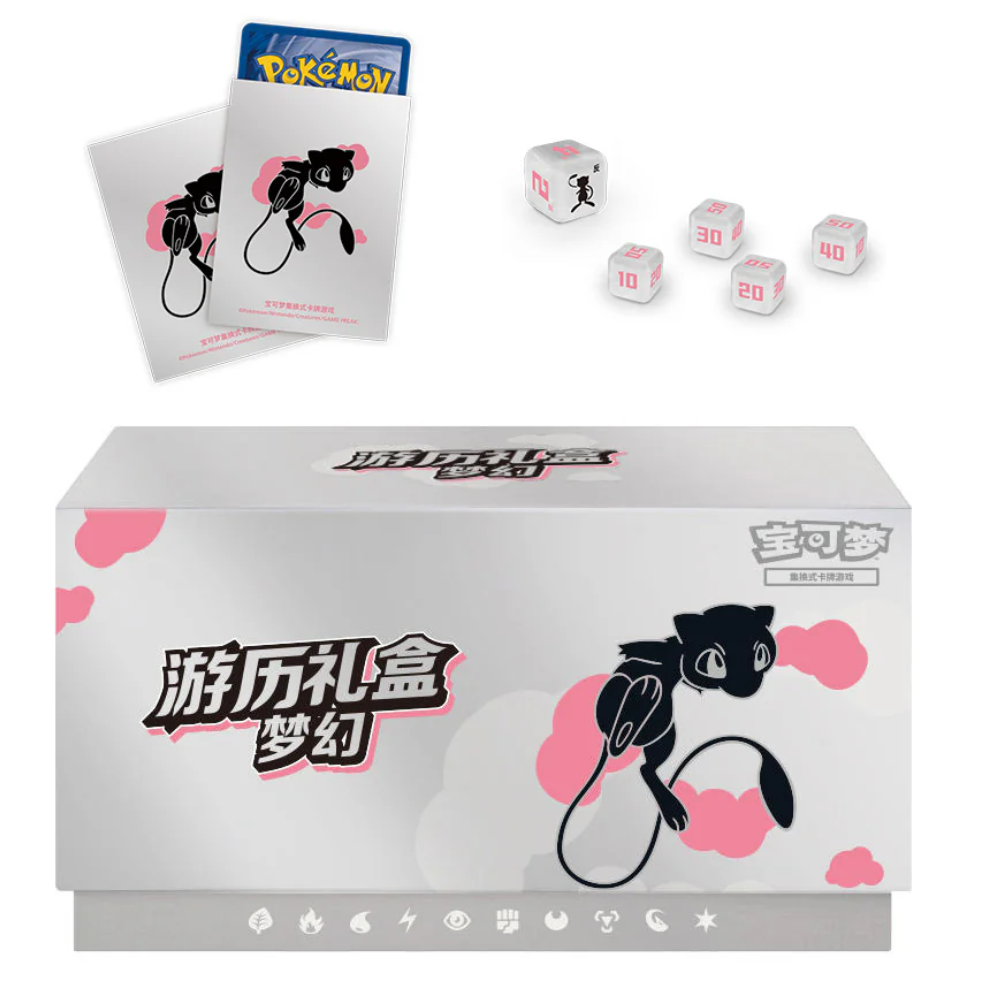 Il Mew Travel Gift Box (CHN) è un set da viaggio compatto ed elegante, pensato per chi desidera giocare e trasportare le proprie carte in modo pratico e ordinato. Include accessori essenziali come bustine protettive e dadi personalizzati, il tutto racchiuso in un box rigido dal design ispirato a Mew, delicato ma distintivo.