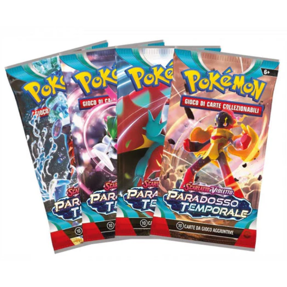 All’interno troverai 10 carte ufficiali del Pokémon TCG tratte dall’espansione Scarlatto & Violetto – Paradosso Temporale, un set che mette in primo piano i celebri Pokémon Paradosso insieme a nuove e spettacolari forme Teracristal. Ogni apertura è un piccolo viaggio tra epoche che collidono: potresti incontrare antiche bestie selvagge, versioni futuristiche corazzate o Pokémon-ex potenziati da effetti unici.
