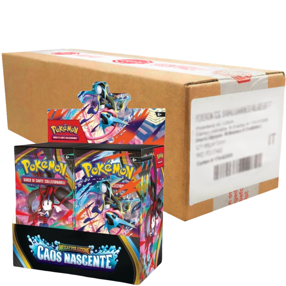 Il case Pokémon Megaevoluzione Caos Nascente rappresenta il formato più completo e professionale disponibile per questa espansione del Gioco di Carte Collezionabili Pokémon. Pensato per soddisfare le esigenze di rivenditori, collezionisti esperti e giocatori competitivi, questo prodotto include più display sigillati contenenti bustine ufficiali in lingua italiana della serie Mega Evoluzione Caos Nascente.