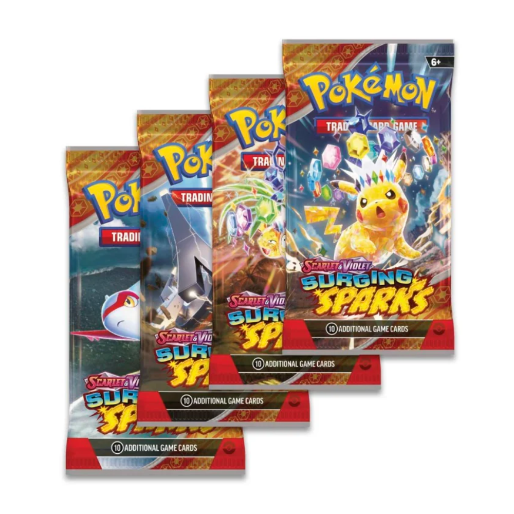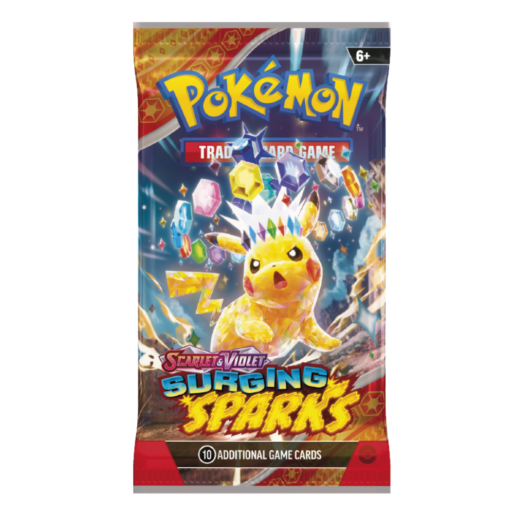 La bustina inglese di Scarlet & Violet – Surging Sparks rappresenta uno dei modi più immediati e accessibili per avvicinarsi all’espansione o per arricchire una collezione già avviata. All’interno si trovano 10 carte assortite tratte dal set, selezionate con la tipica struttura delle bustine Pokémon: una combinazione di carte comuni, non comuni e almeno una carta speciale, che può essere una rara, un’olografica o, nelle migliori delle ipotesi, una delle nuove versioni Pokémon-ex Teracristal presenti nell’espansione. Ogni bustina è sempre diversa, e proprio questa imprevedibilità è ciò che da anni rende il formato da 10 carte una scelta costante per i collezionisti di ogni livello.
